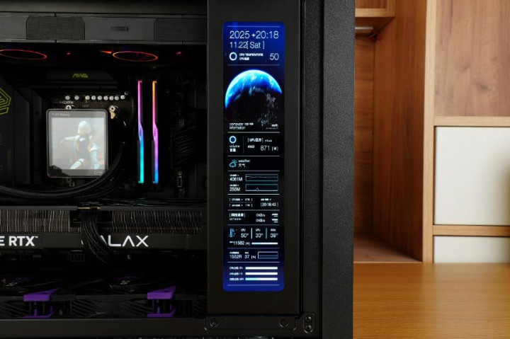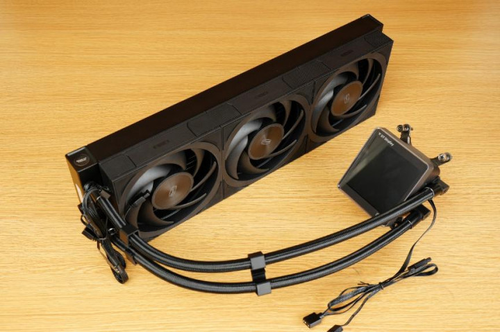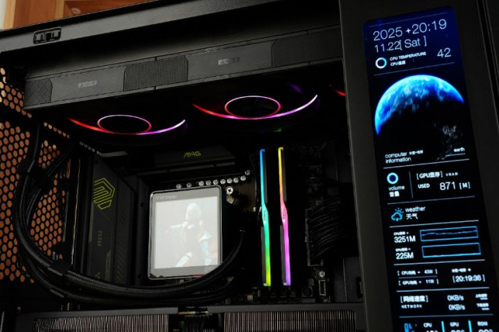 银翼DT360所搭载的风扇是超频三最新推出的光翼F7 X120积木风扇,整体采用了玻璃纤维+PBT的材质,扇叶针对冷排这种高阻力的使用场景进行了加宽加厚,以此提升穿透力。屏幕则是一块3.4 英寸IPS屏幕,支持480x480 分辨率与 60Hz 刷新率,通过 CPS 软件可自定义主题、上传动效素材。