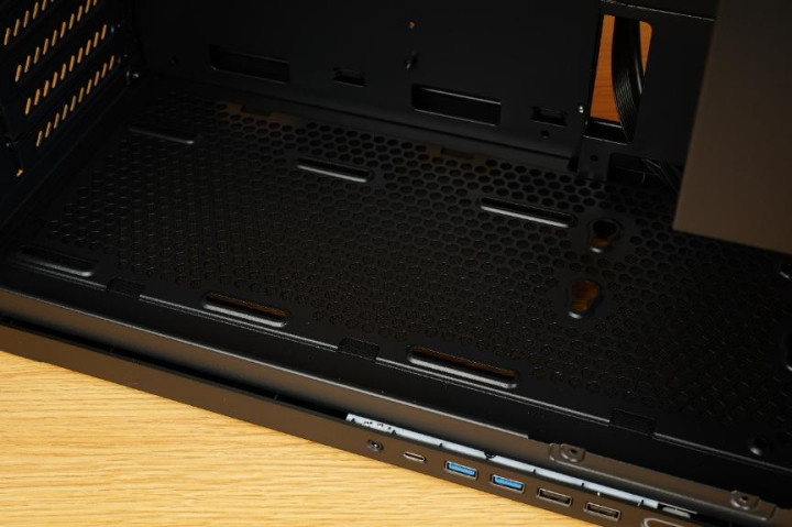 机箱底部还设有风扇以及硬盘安装位置,可以选择安装3把120mm规格的风扇或者是可以额外安装1个3.5寸HDD硬盘。