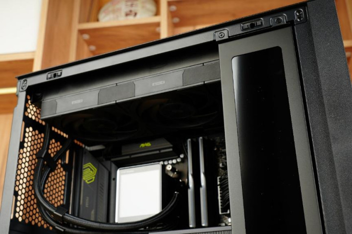 机箱顶部快拆盖板内测覆盖有防尘网,并且顶部的风扇支架最大可以支持360冷排的安装,这点还是令人相当吃惊的。
